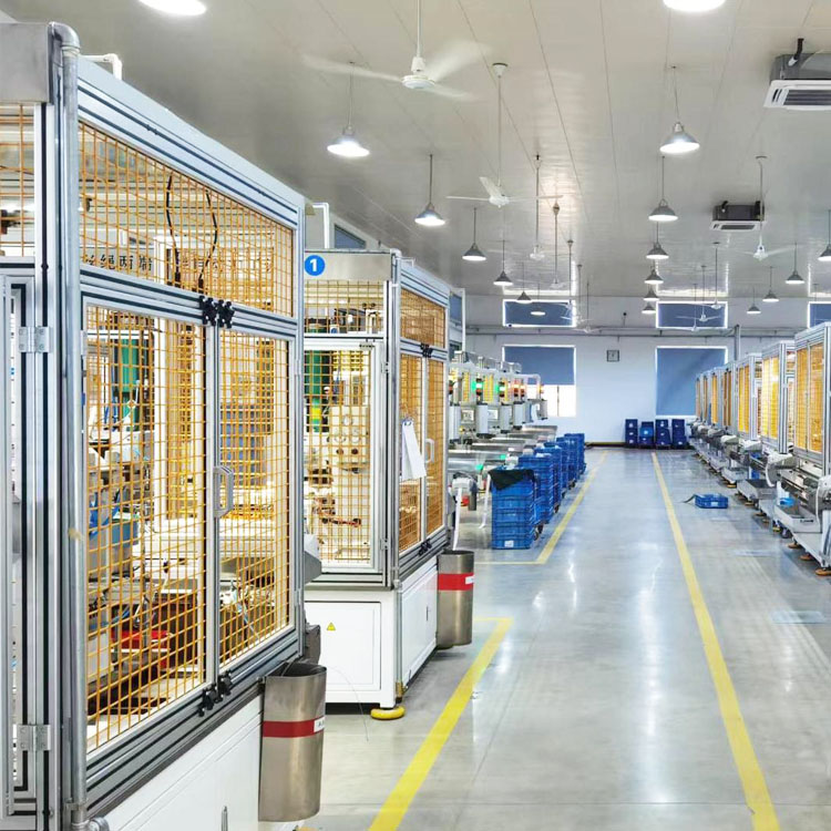 Modular frame with mesh enclosures, emergency stops, and accessible maintenance doors