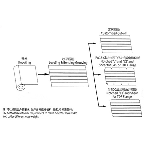 Line III consists of a decoiler, leveling & grooving rollers, hydraulic notching & punching machine, hydraulic shearer and hydraulic folder. The electrical control system uses a computer with a closed-loop servo-system to increase the precision and reliability of the line.