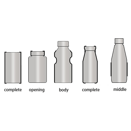 Labels bottles 28-125mm diameter including round, square, and irregular shapes on single line