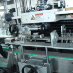 Automatic sleeve labeling with integrated shrink tunnel for 150 bottles per minute.