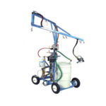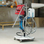 Mounted on a wheeled cart with integrated resin drums, hardener tank, hose management, and control gauges, the machine moves between molds with minimal setup. Available hose lengths of 8 m or 20 m extend the working radius for large structures such as tanks, boat hulls, and building panels.