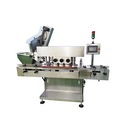 The bottle caps neatened by the cap neatening device ,the bottle caps with mouth up are carried to the caps collecting guideway,the bottles come from other equipment of the assembly line enter the caps collecting area.The bottles move ahead with clamping of the two sides clamping device then the caps match the bottles automatically.The cap pressing device press the caps to the pre-tight situation before rotating the caps.Under the function of three pairs of high speed rotating wearable rubber wheels, the caps match with the bottles tightly.